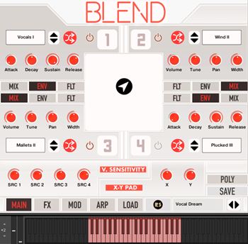 BLEND helps you create literally endless timbres (realistic sound colours) mixing 4 multisample instruments, while offering a pad to morph the sound in real time.