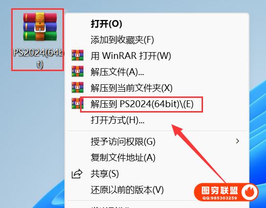 1.鼠标右击【PS2024(64bit)】压缩包,【解压到 PS2024(64bit)】。