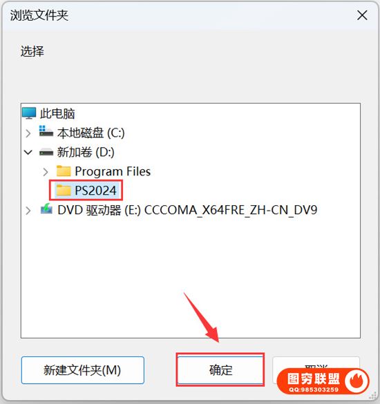 4.点击需要将软件安装的磁盘位置(建议安装除C盘之外的其它磁盘),新建一个【PS2024】文件夹并选中,点击【确定】。