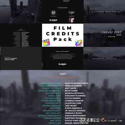 包含5种效果片尾字幕动画(图片Logo/演员表/组员/文字图片/主标题),可以自己随意组合使用,制作想要的效果,所有的文字、字体、颜色、出入动画、背景模糊度、位置大小、间距等各种参数都可以修改
