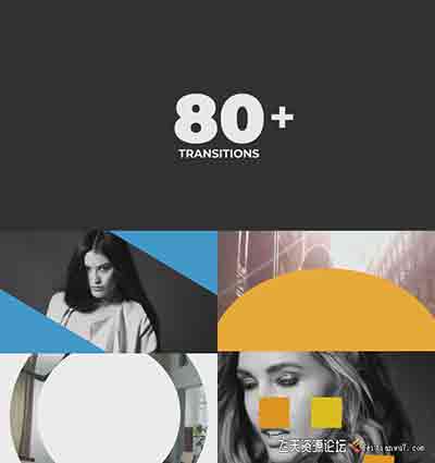 包含80组图形视频转场,包含简单的图形转换、数字转场、百叶窗转场等基本视频转场效果,转场的颜色可以修改,放到两个视频中间即可