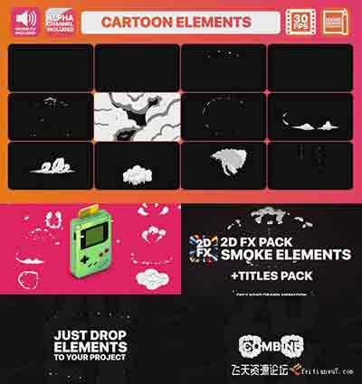 FCPX插件饭12个手绘卡通烟雾MG动画元素+3组文字标题动画