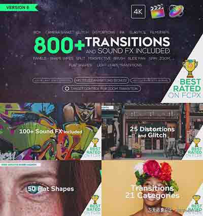 FCPX插件:800组4K视频转场调色预设文字标题音效素材v6